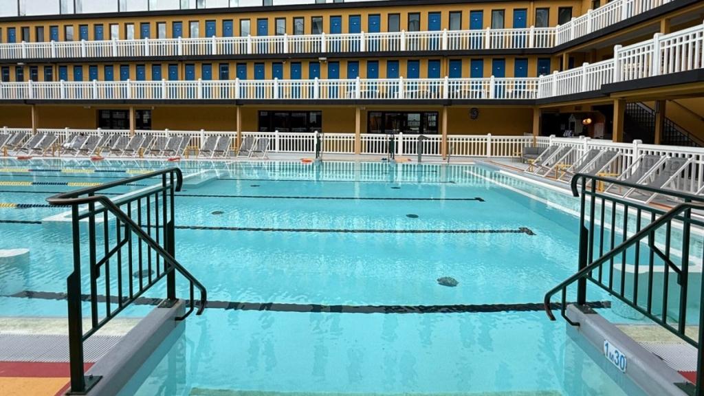 The domed shape of the outdoor pool and surrounding changing cabins were, in 1929, all part of designer Lucien Pollet’s vision of creating a space that mirrors a luxury ocean cruiseliner, while the bright colors were his way of bringing joy to a young daughter who was going through an illness that required her to spend long stretches of time inside hospital walls.